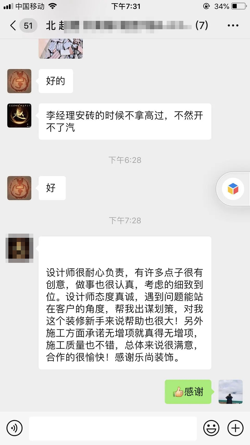 樂(lè)尚工作人員認(rèn)真負(fù)責(zé),經(jīng)驗(yàn)豐富,工地現(xiàn)場(chǎng)打掃的很干凈,管理井然有序。同時(shí)做到了和客戶真誠(chéng)的溝通,解決了客戶裝修過(guò)程中各種問(wèn)題,故特致此,以示感謝!