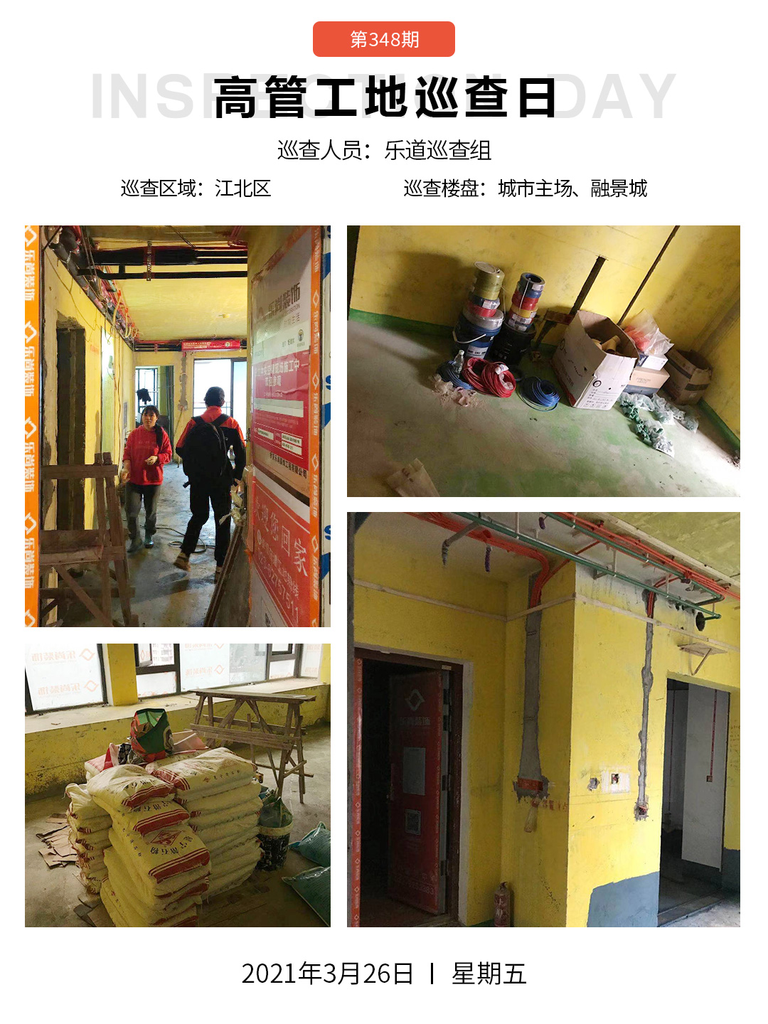 工地巡查日,樂尚裝飾再次出發(fā)進(jìn)行工地大巡查。本著始終把工地質(zhì)量和安全視為企業(yè)命脈,公司高管團(tuán)隊(duì)分組帶領(lǐng)巡查組深入一線工地現(xiàn)場(chǎng),從工程管理、工程質(zhì)量、工程安全、工程進(jìn)度、工地形象、工地服務(wù)等實(shí)際情況進(jìn)行全面巡查,督促裝修進(jìn)度、過濾異常問題、提升工地形象。