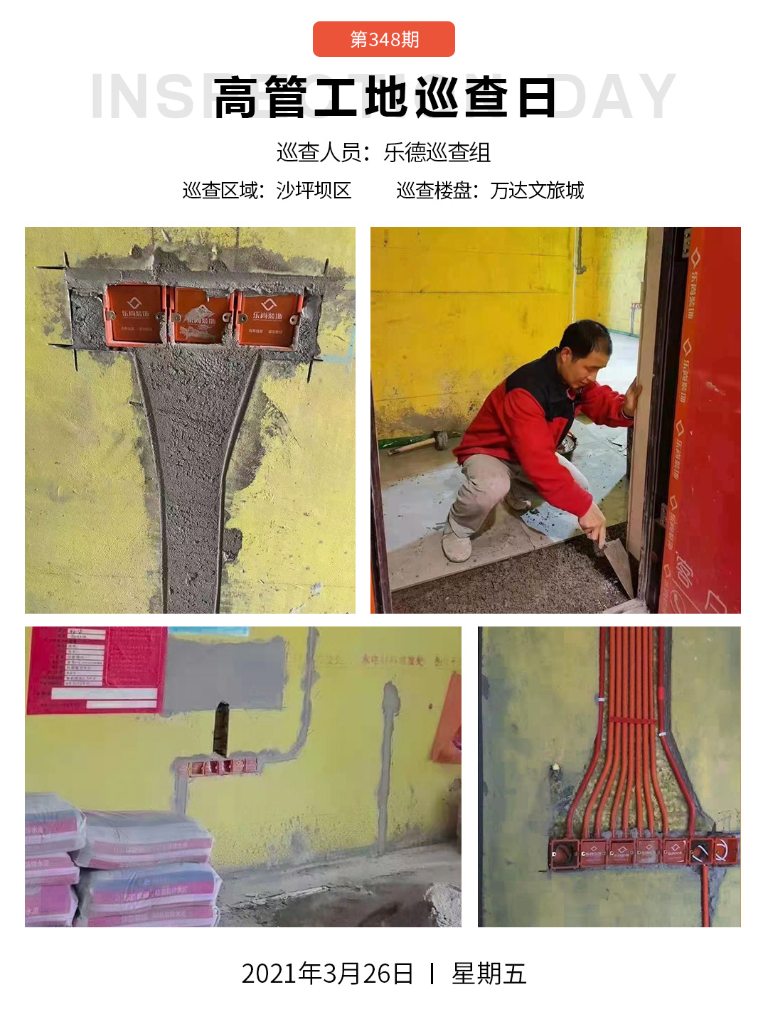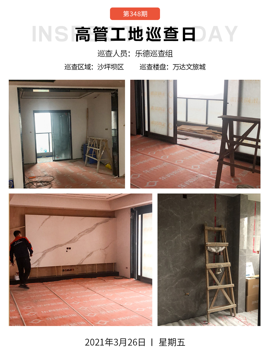 樂尚裝飾高管團(tuán)隊(duì)帶領(lǐng)的巡檢組走進(jìn)主城區(qū)各大樓盤數(shù)十家在建工地,嚴(yán)格要求工地施工質(zhì)量,對(duì)工地所存在的問題進(jìn)行改正,保障渝鉆工藝落地。2021年3月26日我們依然以認(rèn)真的態(tài)度堅(jiān)持為廣大業(yè)主朋友新家裝修保駕護(hù)航。