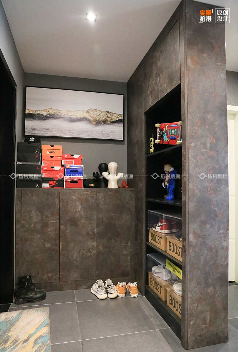 為滿足業(yè)主存放很多雙球鞋的需求,所以在玄關(guān)處設(shè)置大大的鞋柜。