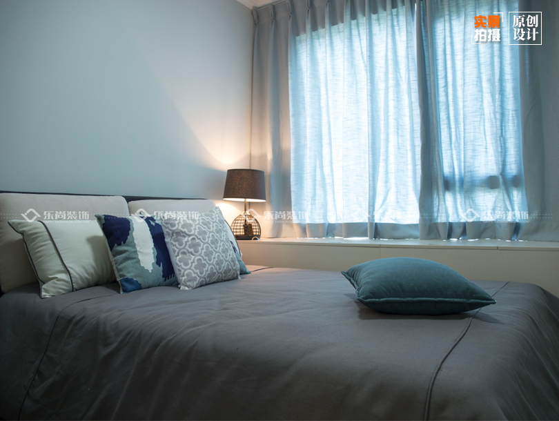 次臥當(dāng)時(shí)做的是一個(gè)AB分區(qū)的顏色床頭墻面是藍(lán)灰色 四周是米白色這樣會(huì)使整個(gè)空間感增強(qiáng),淺藍(lán)色的窗簾作為點(diǎn)綴,因?yàn)榇闻P是平時(shí)沒人住所以就比簡潔介化,但是簡潔又不失檔次。
