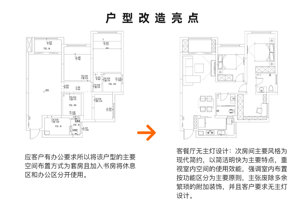 3、客餐廳無主燈設(shè)計(jì):次房間主要風(fēng)格為現(xiàn)代簡約,以簡潔明快為主要特點(diǎn),重視室內(nèi)空間的使用效能,強(qiáng)調(diào)室內(nèi)布置按功能區(qū)分為主要原則,主張廢除多余繁瑣的附加裝飾,并且客戶要求無主燈設(shè)計(jì)。