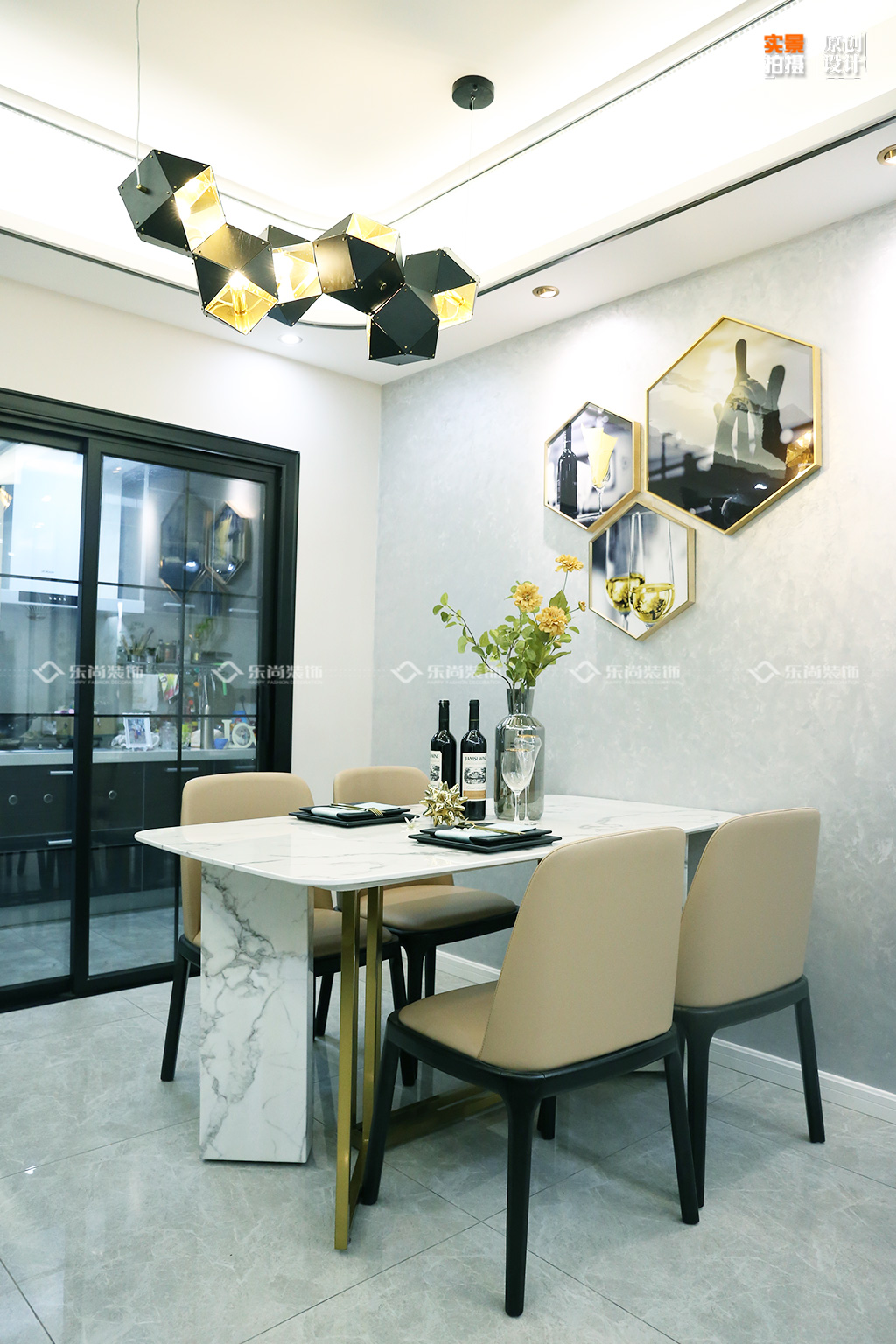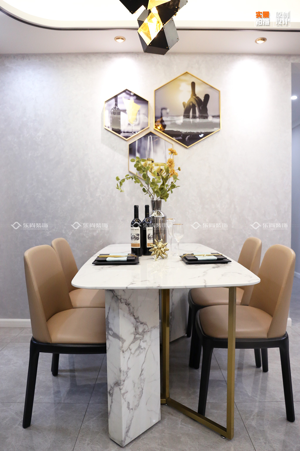 餐廳作為與客廳同一空間不同功能的存在,色彩搭配與客廳有異曲同工之妙;餐桌采用白色大理石材質(zhì),彰顯品質(zhì)感。