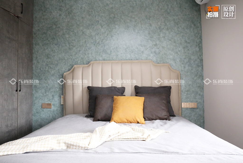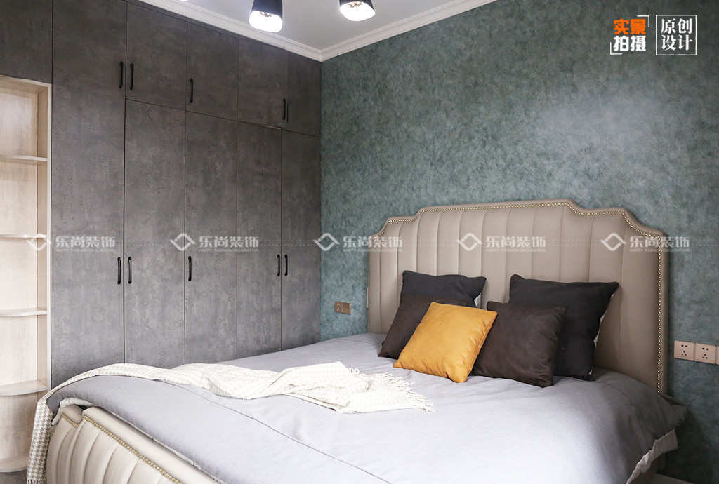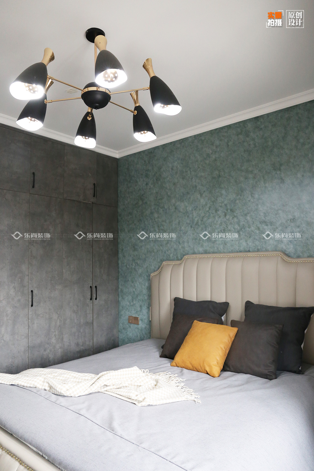 簡潔的臥室空間,衣柜選擇蔣老師喜歡的灰色調(diào),床頭背景墻墨綠色墻衣裝飾,加入愛馬仕橙飾品增加空間的活力,滿足了業(yè)主的歸屬感。