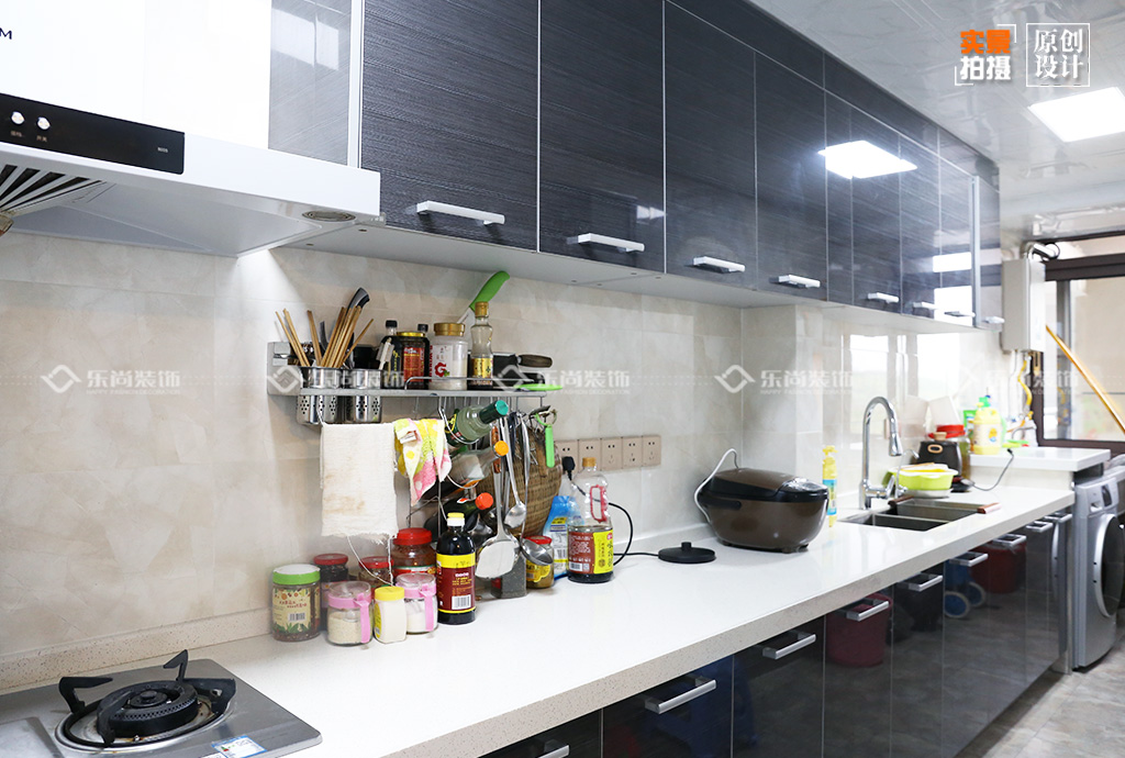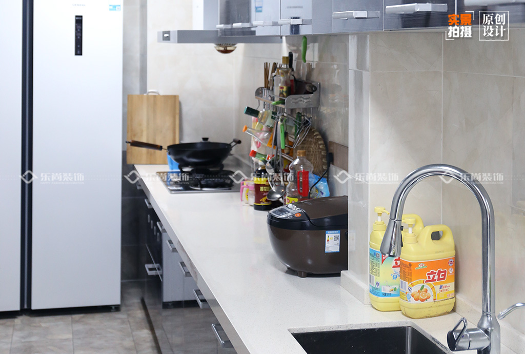 “一”字型寬敞的廚房空間,動(dòng)線設(shè)計(jì)合理,深色的櫥柜,搭配米色的瓷磚,干凈又不失品質(zhì),讓做飯也成為一種樂趣。