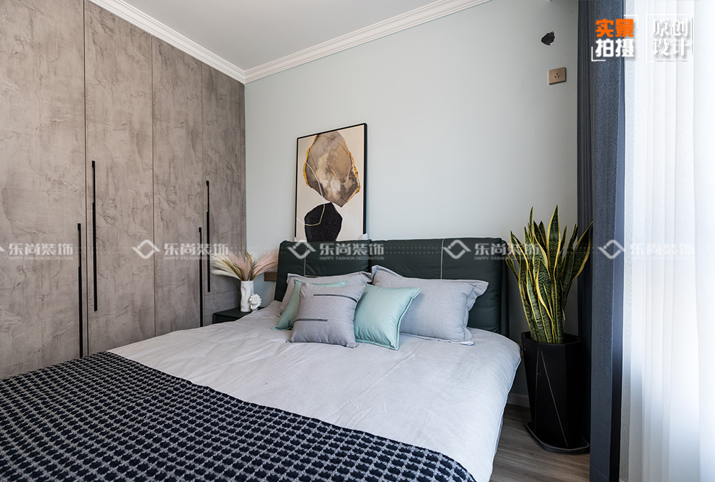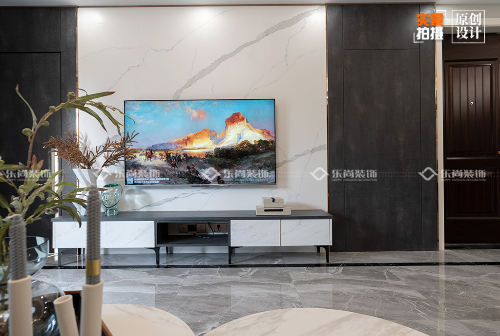 電視墻旁邊就是次臥門,運(yùn)用了隱形門造型,很好的把電視墻造型融合,擴(kuò)大了電視墻的尺寸。