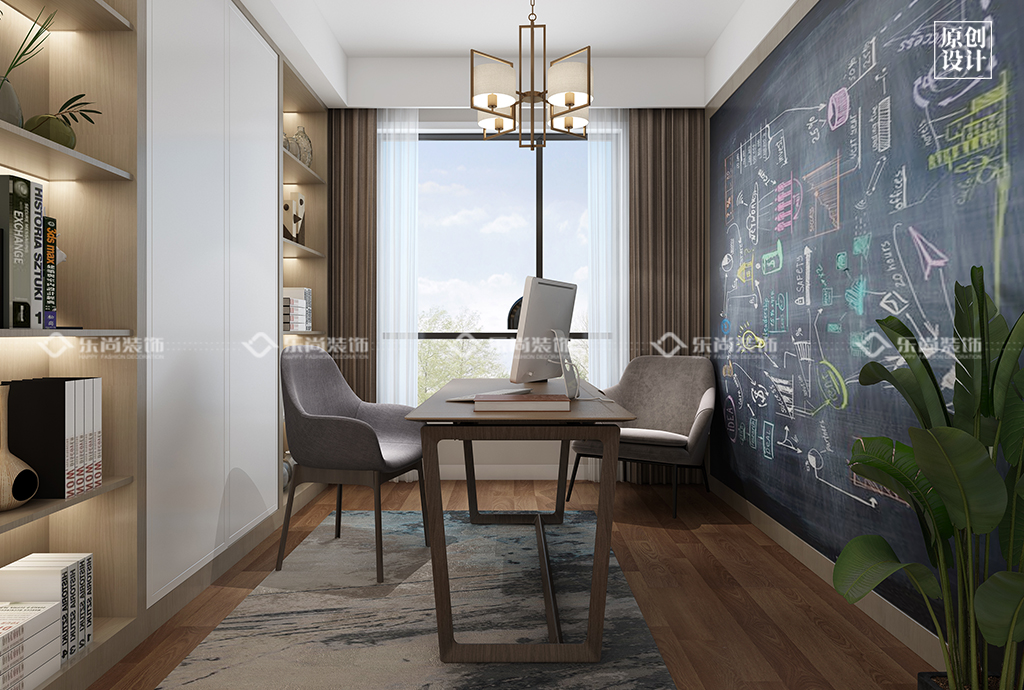 書房墻面設置黑板墻,讓主人家在辦公的同時還能兼顧孩子的成長時刻互動增加家庭中的趣味。