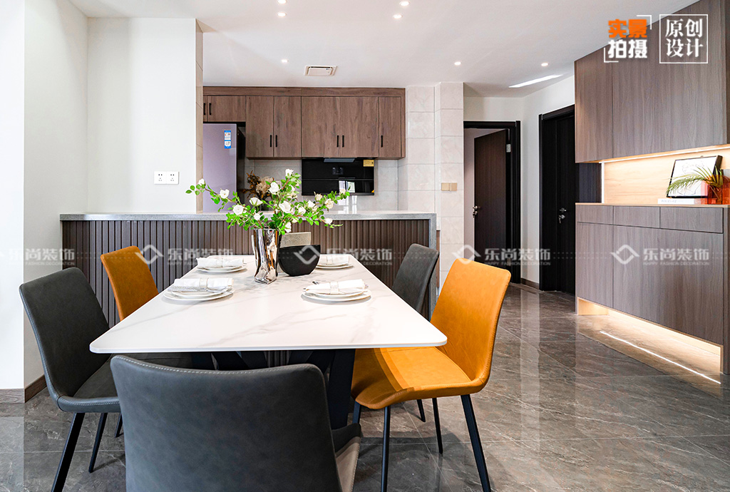 餐廳在廚房吧臺(tái)旁邊,這里是一處融洽的空間,無(wú)主燈照明多了一些氛圍感。簡(jiǎn)潔的大理石餐桌,搭配橙色與黑色的餐座椅,讓餐廳滿足功能性的同時(shí)也多了一些層次與質(zhì)感。