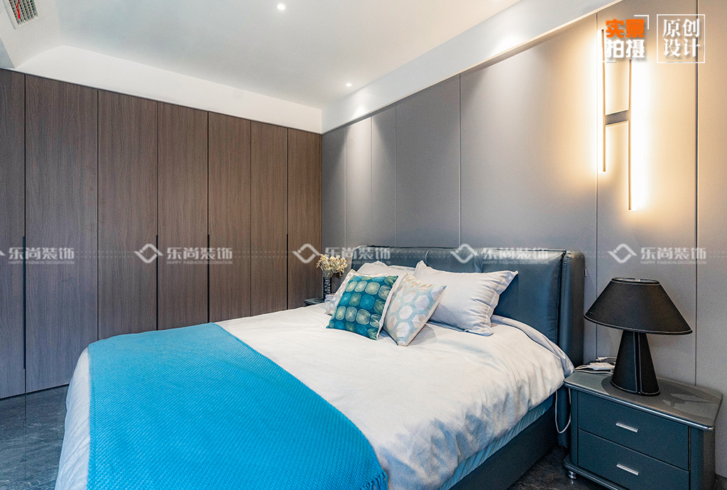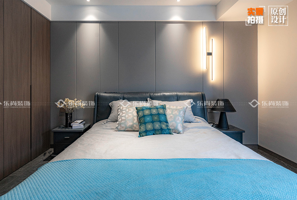 在光源的設(shè)計(jì)上,臥室也是全屋無(wú)主燈,在床頭設(shè)計(jì)一組壁燈,晚上起夜也不會(huì)影響另一半的休息,起到照明的同時(shí),也弱化了空間的中心點(diǎn),加上床頭背景墻淺灰色的軟包,也可以讓空間更加的通透自然,到頂?shù)拇笠鹿瘢烙^大氣也增加了整體的收納性。