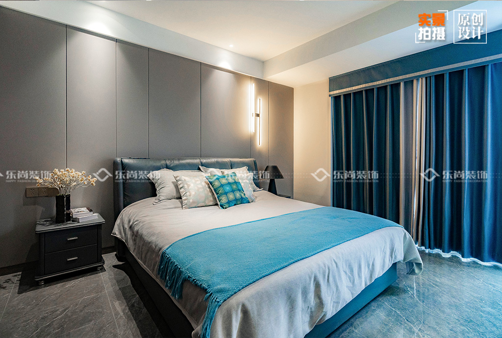 臥室作為心靈與身體放松的空間,用極簡(jiǎn)的設(shè)計(jì)手法營(yíng)造出簡(jiǎn)約舒適的空間。進(jìn)入臥室延續(xù)了整體風(fēng)格,淺灰色和白色為主,但是在軟裝上大量使用低飽和度的藍(lán)色窗簾,以及床品,讓臥室呈現(xiàn)靜謐舒適之感。