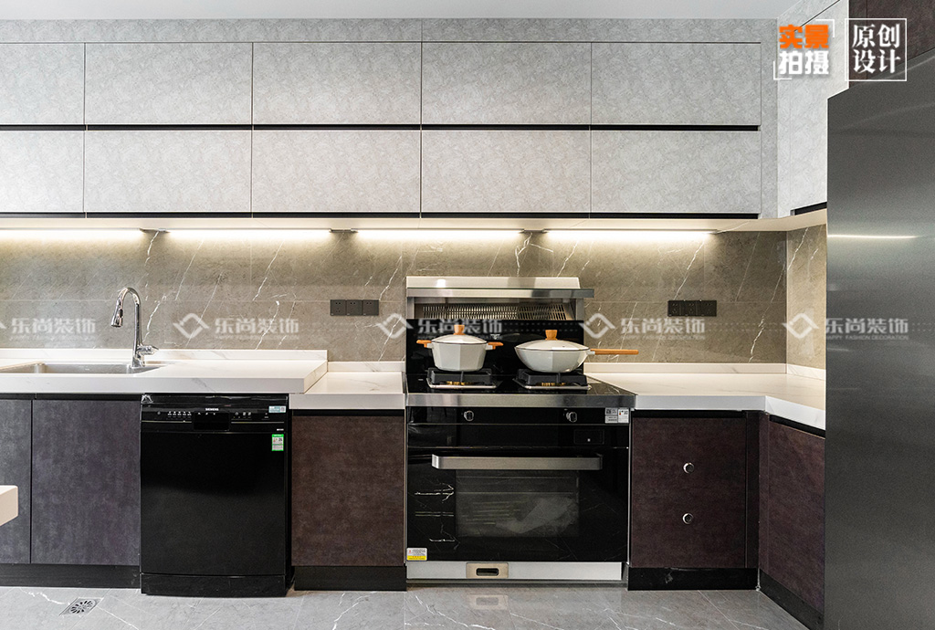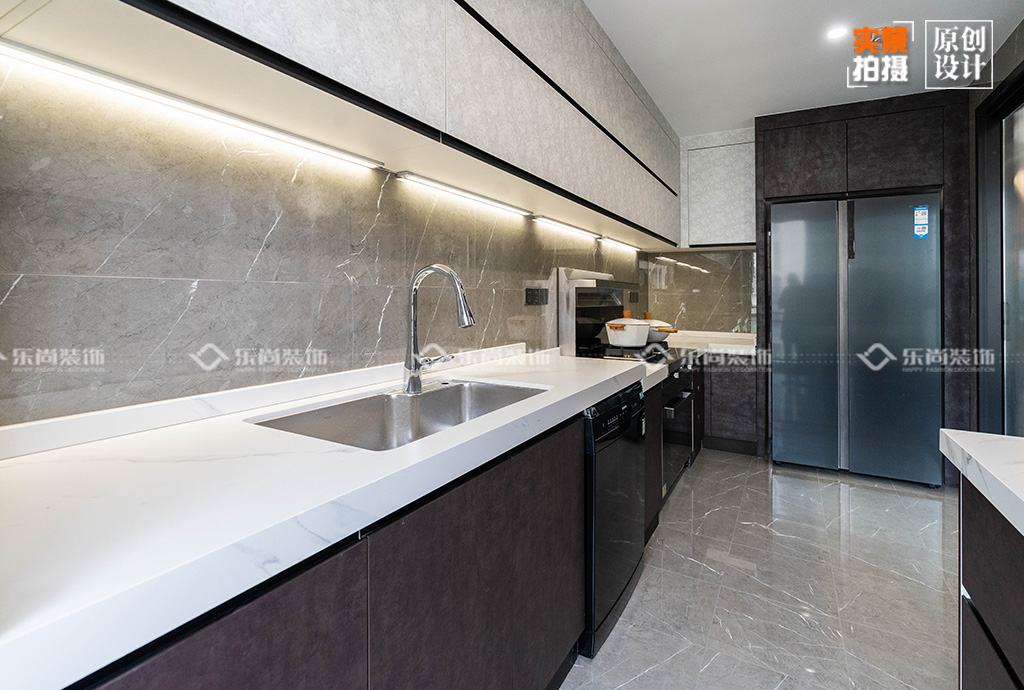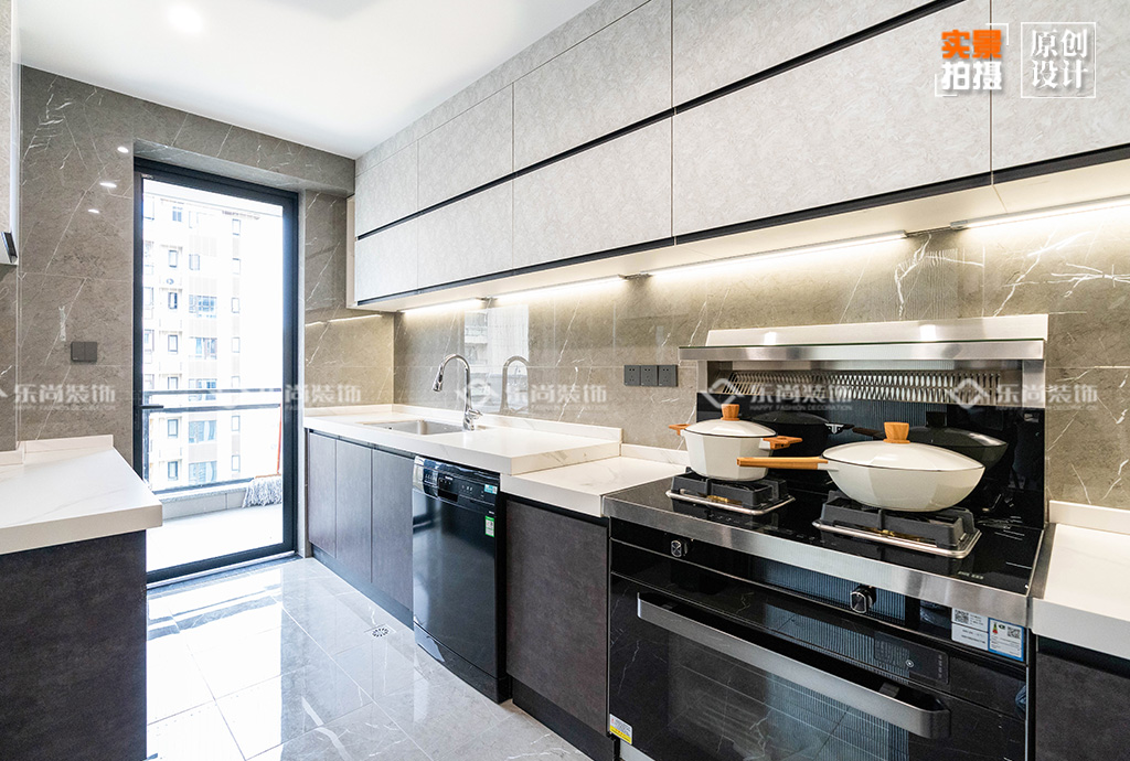業(yè)主兩人工作都特別忙,所以不經(jīng)常下廚。我們?cè)趶N房的設(shè)計(jì)上,進(jìn)行了很多人性化的處理,比如通過(guò)改滑門增大了廚房采光等。