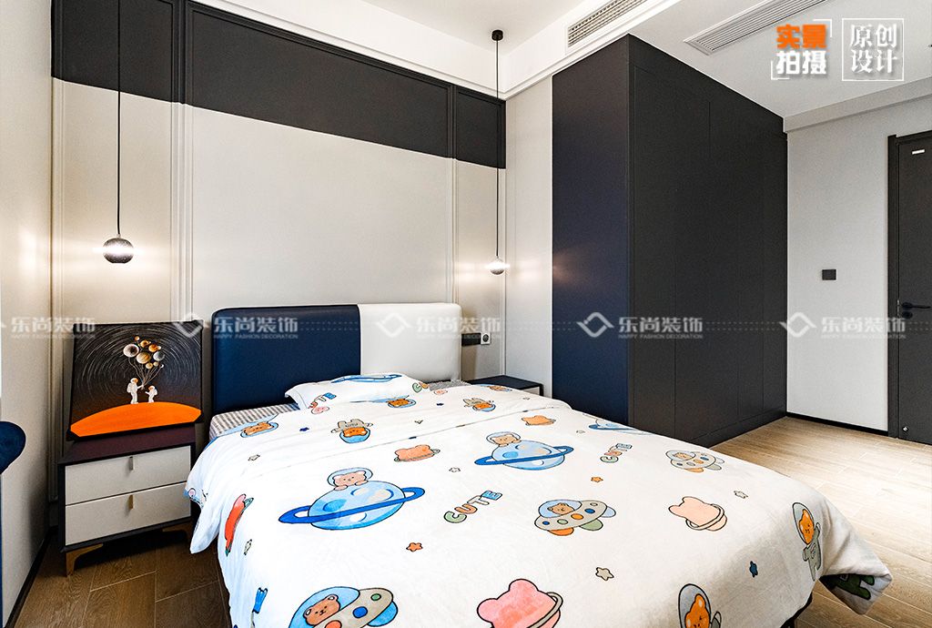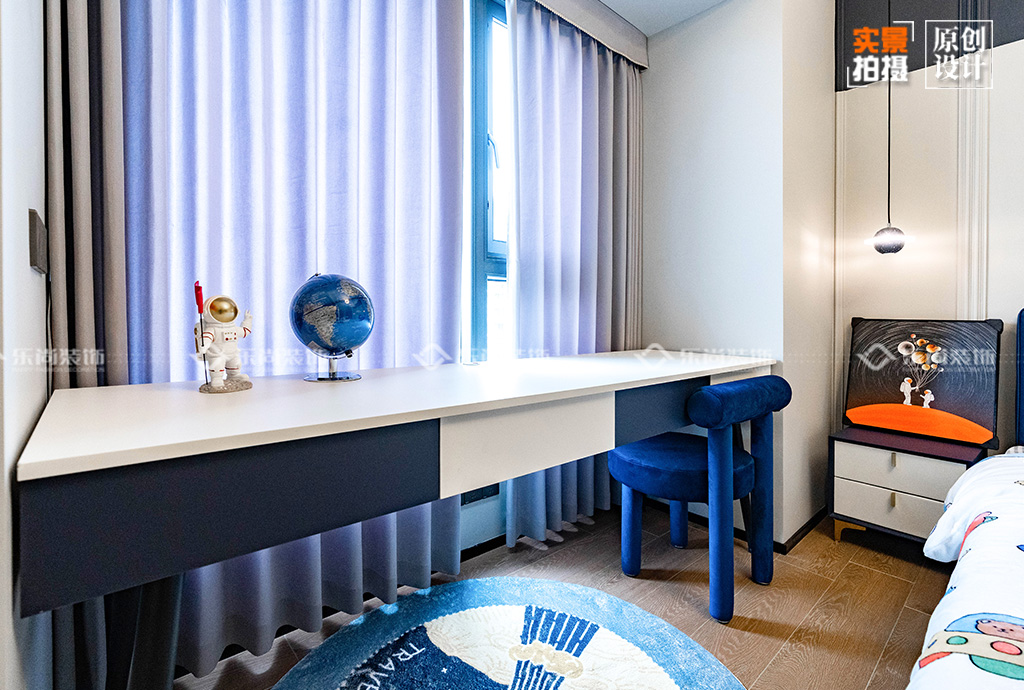藍(lán)白的搭配,與其他空間既有共性卻也獨(dú)特,更加貼合男孩子的審美;書桌結(jié)合座椅,給孩子一個(gè)好的學(xué)習(xí)氛圍; 除此之外,留了更多的空間,等孩子自己去填滿它。